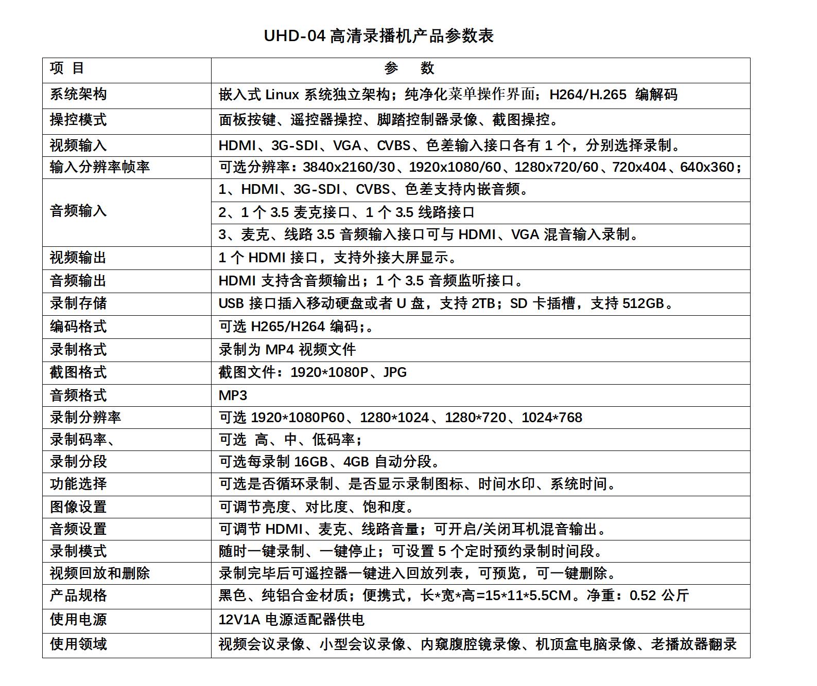 四、使用范围UHD-04高清硬盘录像机,由于输入接口全面、支持录制分辨率高、操控模式多、可调录制参数多,机器小巧精致,使用非常方便,适合使用的领域极为广泛。一般高清粉丝家庭,可以录制数字电视机顶盒、蓝光高清播放机、DV机、笔记本以及台式电脑、老式磁带录像机等各类播放设备;企业单位,可以录制会议高清摄像机、各类播放数据资料的笔记本台式电脑;医院手术室可以录制内窥腹腔镜等设备。凡是输出接口对应的播放设备,均可以进行高清录播。UHD-04,售价低廉,具有极高的性价比!